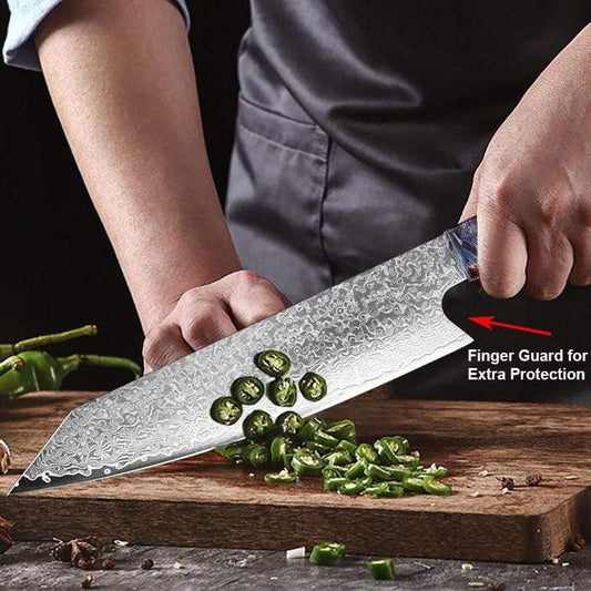 - Damascus Kiritsuke Knife: A striking blade with a wavy Damascus pattern, offering superior sharpness and edge retention. Perfect for professional chefs and home cooks alike.