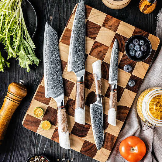 Exceptional Sharpness: With blades crafted from high-quality Damascus steel or high-carbon steel, our Santoku knives offer razor-sharp edges that make every cut clean and precise.