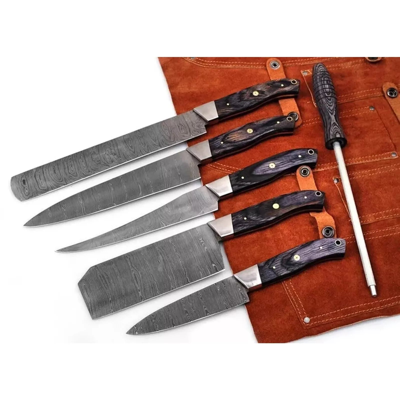 Black Wood 6-Piece Damascus Steel Knife Set and Leather Roll Bag