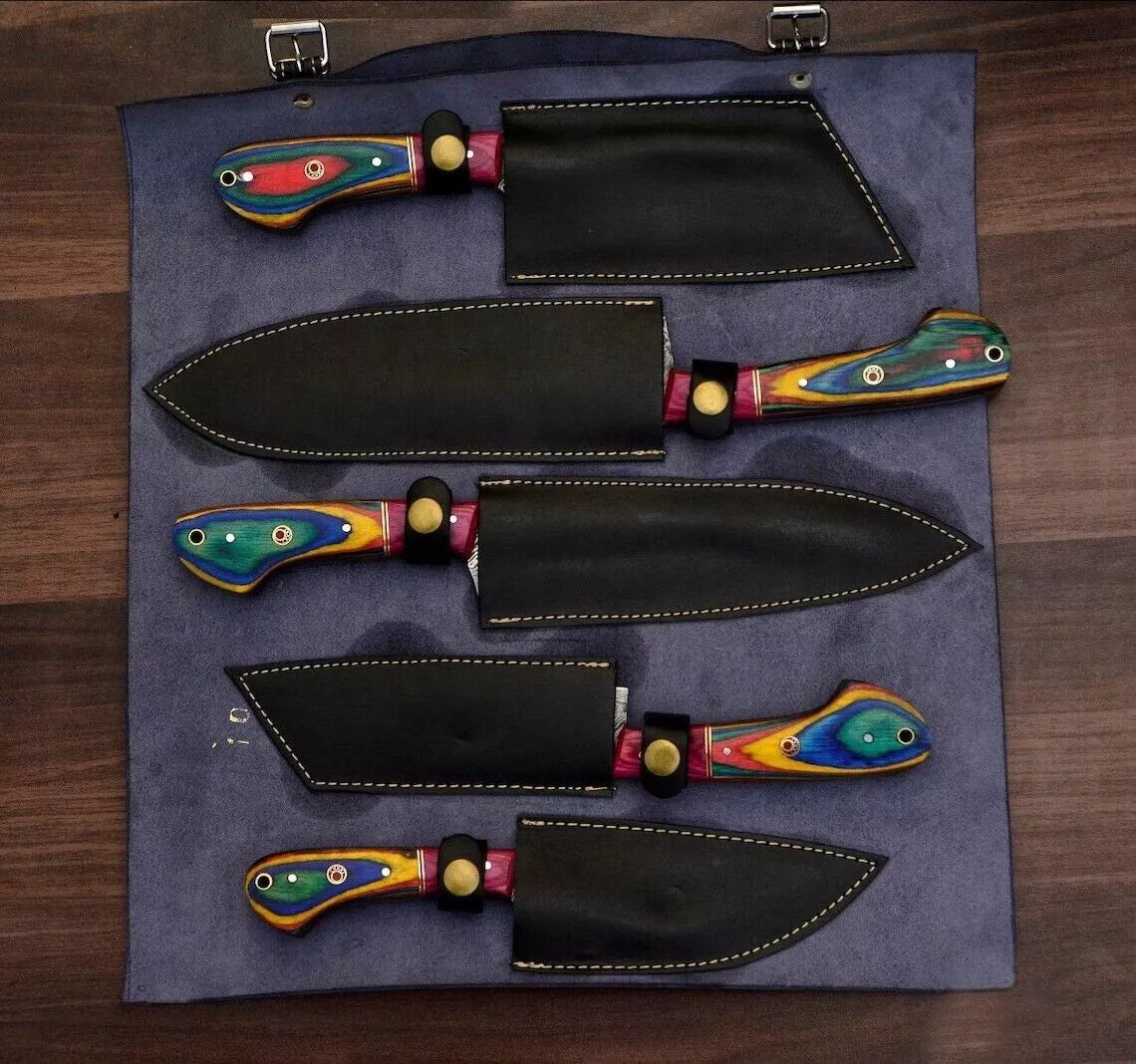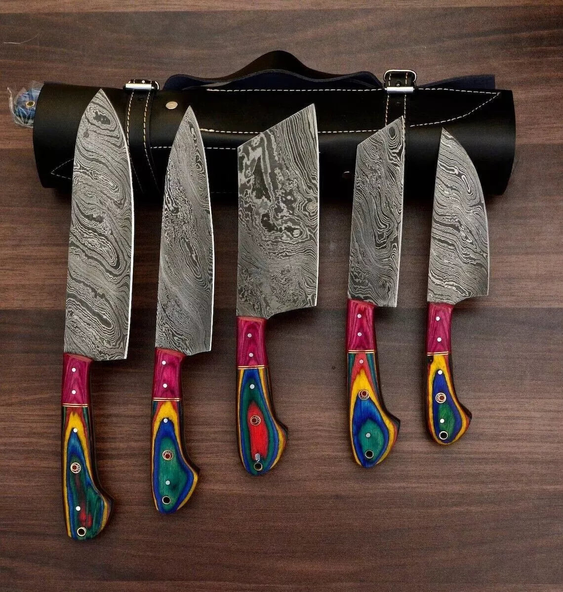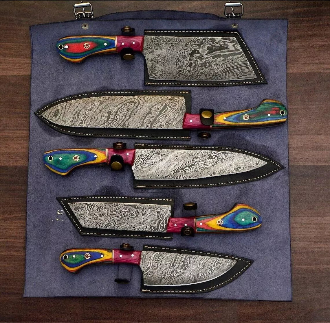 Colorful 5-Piece Damascus Knife Set and Leather Roll Bag
