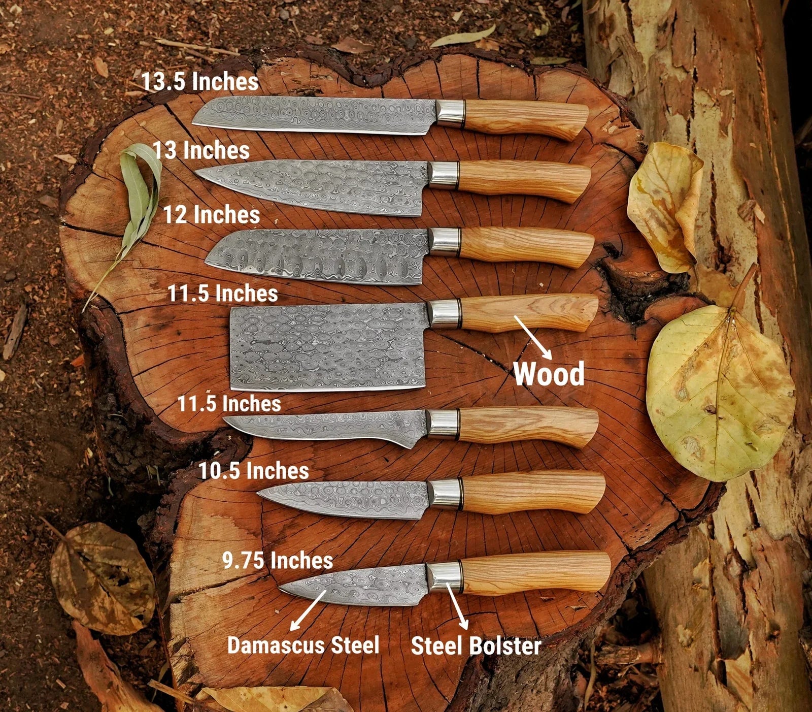 - 7 Knives: 13.5" chef knife, 13" chef knife, 12" chef knife, 11.5" chef knife, 10.5" carving knife, 9.75" cleaver, and 11.5" bread cutter.