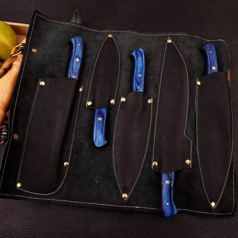 Marine 5-Piece Damascus Knife Set and Leather Roll Bag