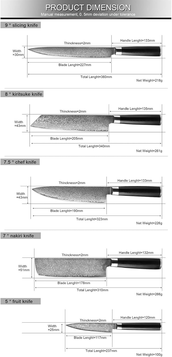 Blade: 67-layer Japanese VG10 Damascus steel core, vacuum heat-treated to 60 ± 2 HRC